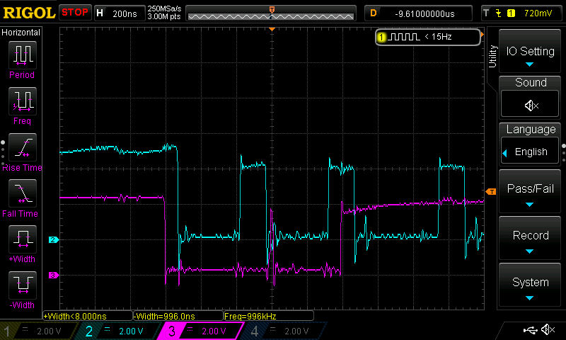 Hier ist das Problem zu sehen. Die hellblaue Kurve zeigt die /AS-Leitung an der FPU; also alle Buszugriffe im Rechner. (Nicht jeder Bus-Zugriff geht zur FPU, natürlich.) Die magenta Kurve zeigt die /CS-Leitung (Chip-Select) an der FPU. Wenn sie "low" ist, wird die FPU angesprochen, reagiert also auf Bus-Zugriffe über /AS usw. Dargestellt ist ein Zugriff auf ein 32-Bit-breites FPU-Register; erkennbar daran, dass zwei Zugriffe in unmittelbarer Folge passiert. Zur Erinnerung: Die 68000-CPU im ST hat nur einen 16-bittigen Datenbus und muss die 32 Bit aus dem Register folglich in zwei "Häppchen" holen.