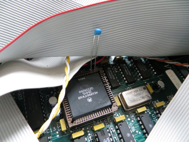Daher habe ich die Nadel rückwärts durch die Dekoderlogik verfolgt und habe eine Stelle gefunden, an der ein deutlich kleinerer Kondensator ausreicht: 270 pF zwischen Pins 7 (GND) und 8 (Ausgang) des 74LS30 mit der Bezeichnung U54: