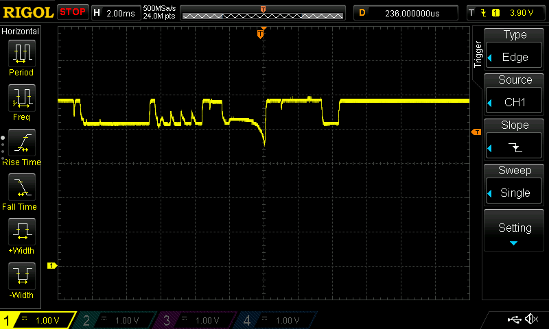 Das USB-Kabel (das erstbeste mit passender Steckern aus der Schublade) hat einen hohen Innenwiderstand. Vermutlich wurde am Leiterquerschitt gespart. Und was passiert: Erst funktioniert die Hardware einwandfrei, meldet sich am USB-Bus an, lässt sich abfragen. Aber wenn man sie intensiver benutzt, insbesondere den stromhungrigen Sendeteil aktiviert, passiert mit der Versorgungsspannung das hier, gemessen am Gerät: