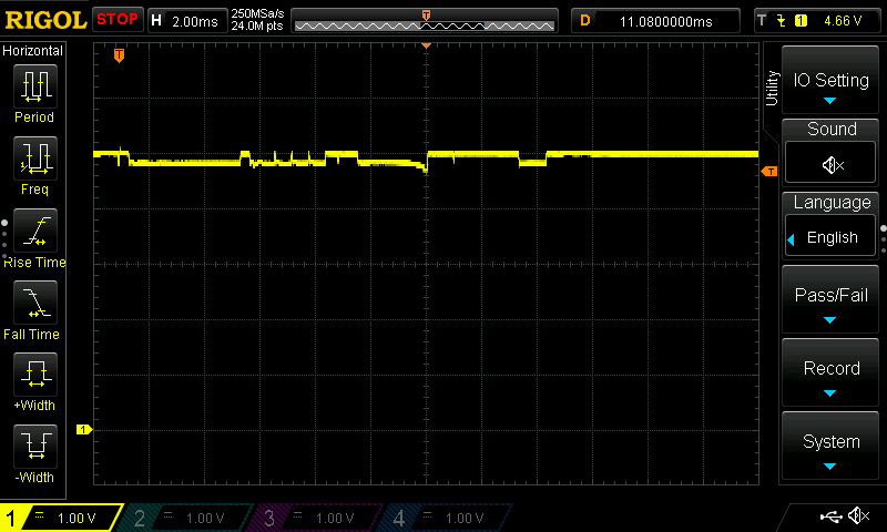 Das USB-Kabel (das erstbeste mit passender Steckern aus der Schublade) hat einen hohen Innenwiderstand. Vermutlich wurde am Leiterquerschitt gespart. Und was passiert: Erst funktioniert die Hardware einwandfrei, meldet sich am USB-Bus an, lässt sich abfragen. Aber wenn man sie intensiver benutzt, insbesondere den stromhungrigen Sendeteil aktiviert, passiert mit der Versorgungsspannung das hier, gemessen am Gerät: